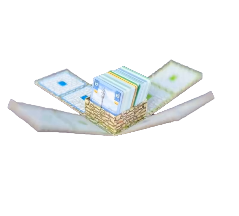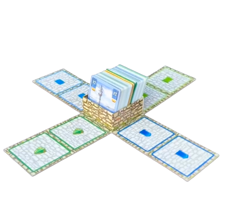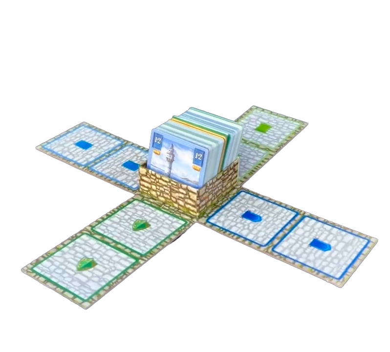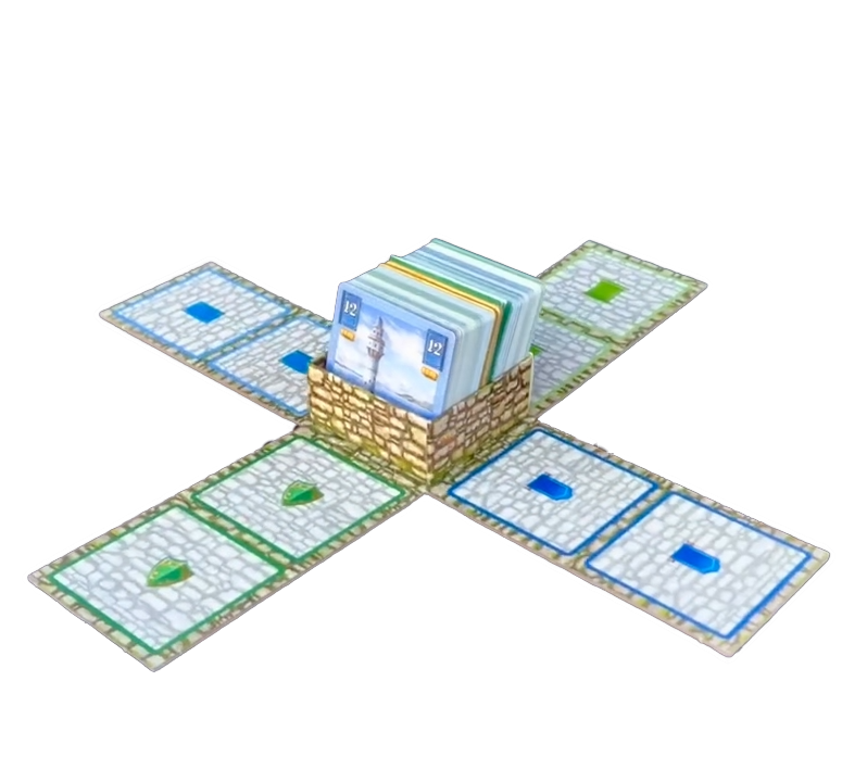 Das Kernstück von TURM ist der gemeinsame Aufbau von acht Türmen, die von Karte 0 bis Karte 12 reichen. Spieler legen abwechselnd